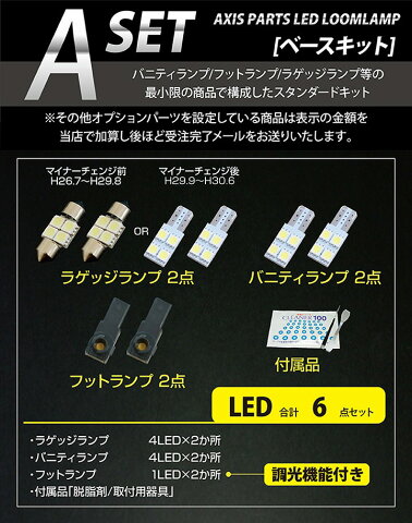 キット内容 ・ラゲッジランプ 2点 ・バニティーランプ 2点 ・フットランプ 2点 合計 6点 ※年式・グレードによっては装着できないこともあります。